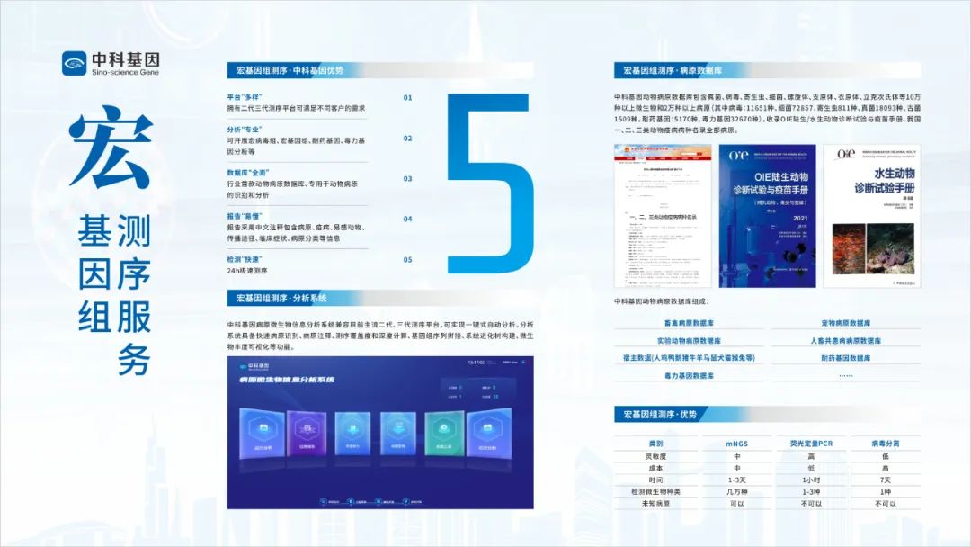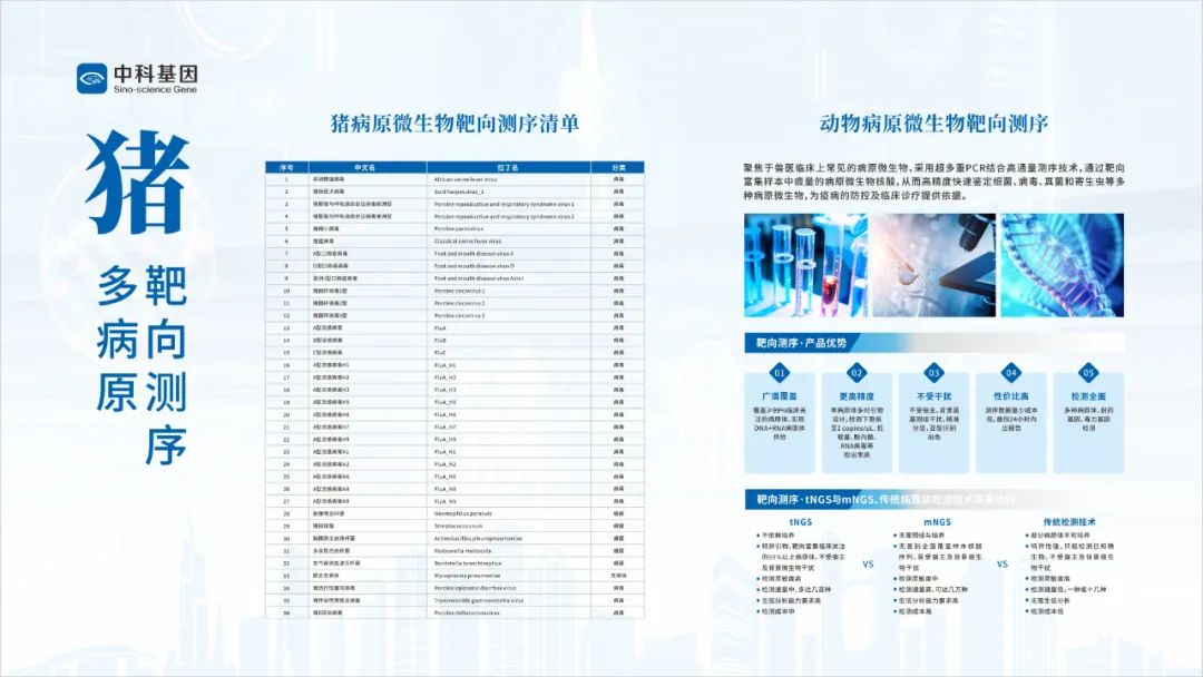 在8月24日的第十屆獸醫大會上,中科基因正式推出了豬多病原靶向測序檢測服務、動物病原微生物宏基因組測序服務兩項新服務項目,其特有的動物病原數據庫收錄了感染畜禽、寵物、實驗動物以及人獸共患病等2萬種以上病原基因組信息,專業的動物病原微生物分析系統將確保高通量測序技術能夠真正地應用于獸醫檢驗檢測、疫病防控乃至動物健康管理等方面。